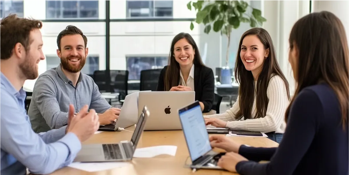 Team collaborating around a table with laptops